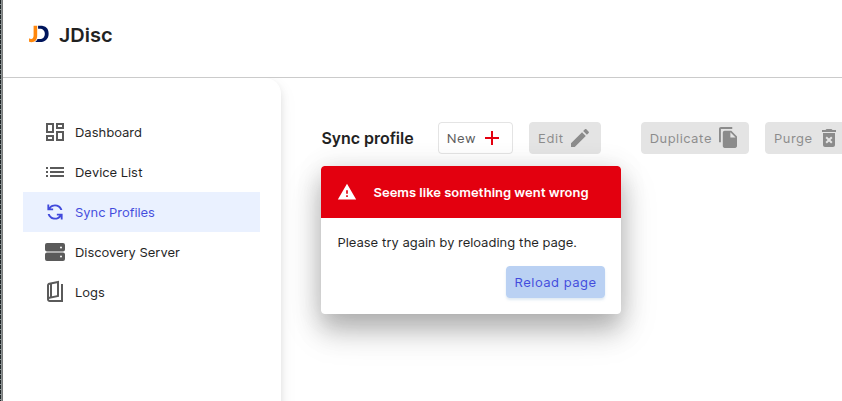 1. Problem: Instead of the Sync profiles, an error message is displayed in the 'Discovery Server' tab of the JDisc Connector add-on.
